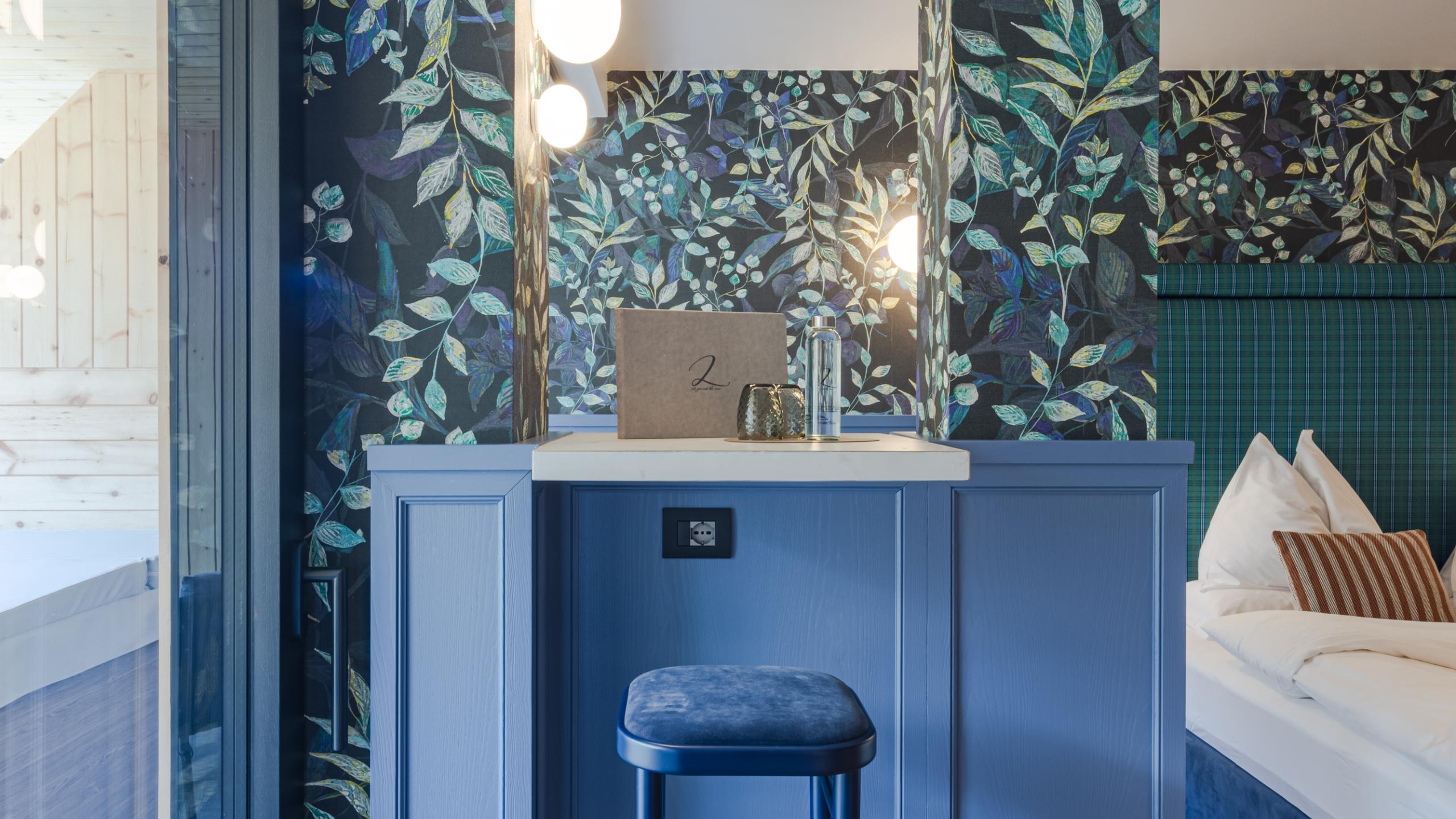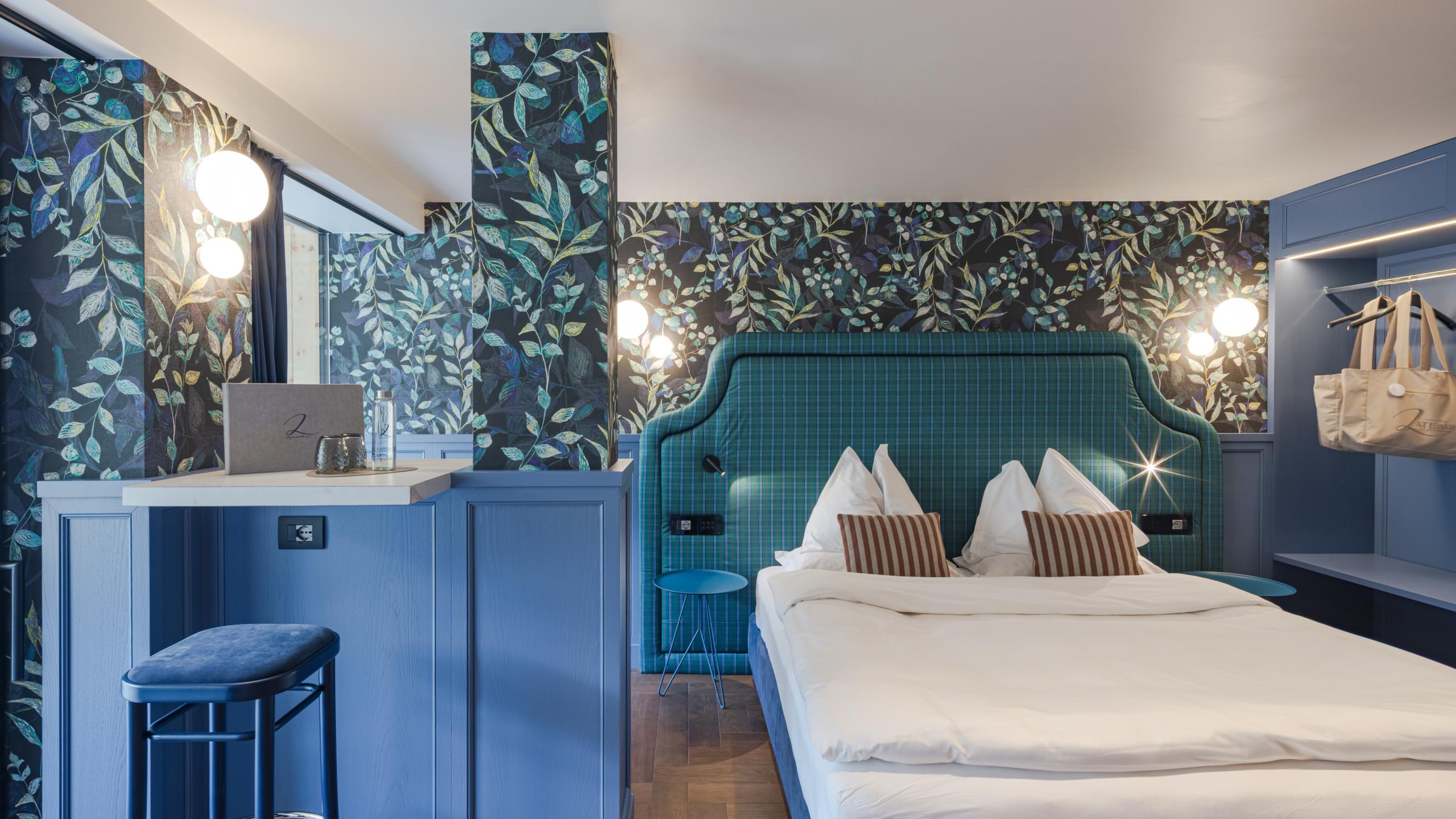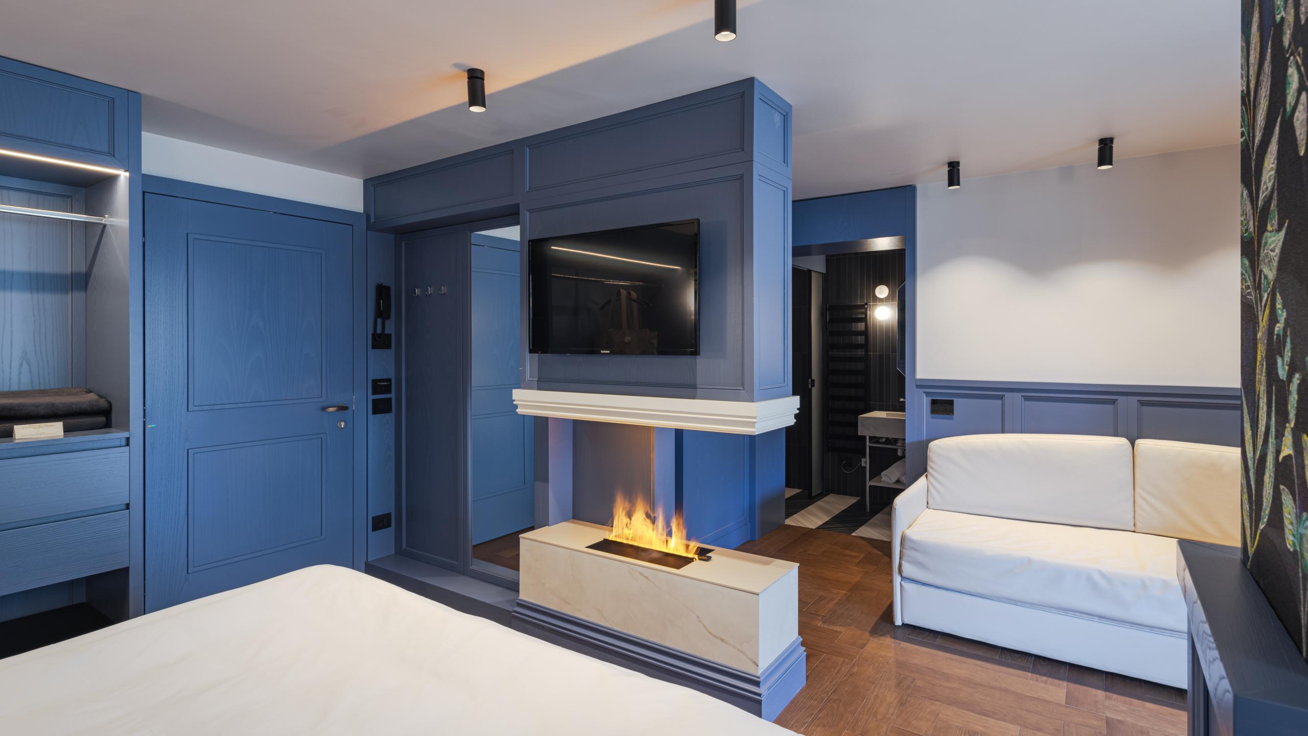 Il restyling dello spazio è disegnato come un abito: fantasie geometriche e floreali, tessuti morbidi al tatto, lampade gioiello. Pavimento in legno naturale posato a mosaico intarsiato, composto da quadrotte. Il caminetto scenografico a vapore in marmo bianco venato si inserisce nella boiserie blu bovary. Il soffitto è di un elegante color cenere e l’architettura del bagno acquisisce forme più scandite e industriali; i materiali dominanti sono il vetro, il ferro e la ceramica. L’elemento iconico della camera è la zona lounge dotata di divano, morbido e perfetto per godere momenti di relax.