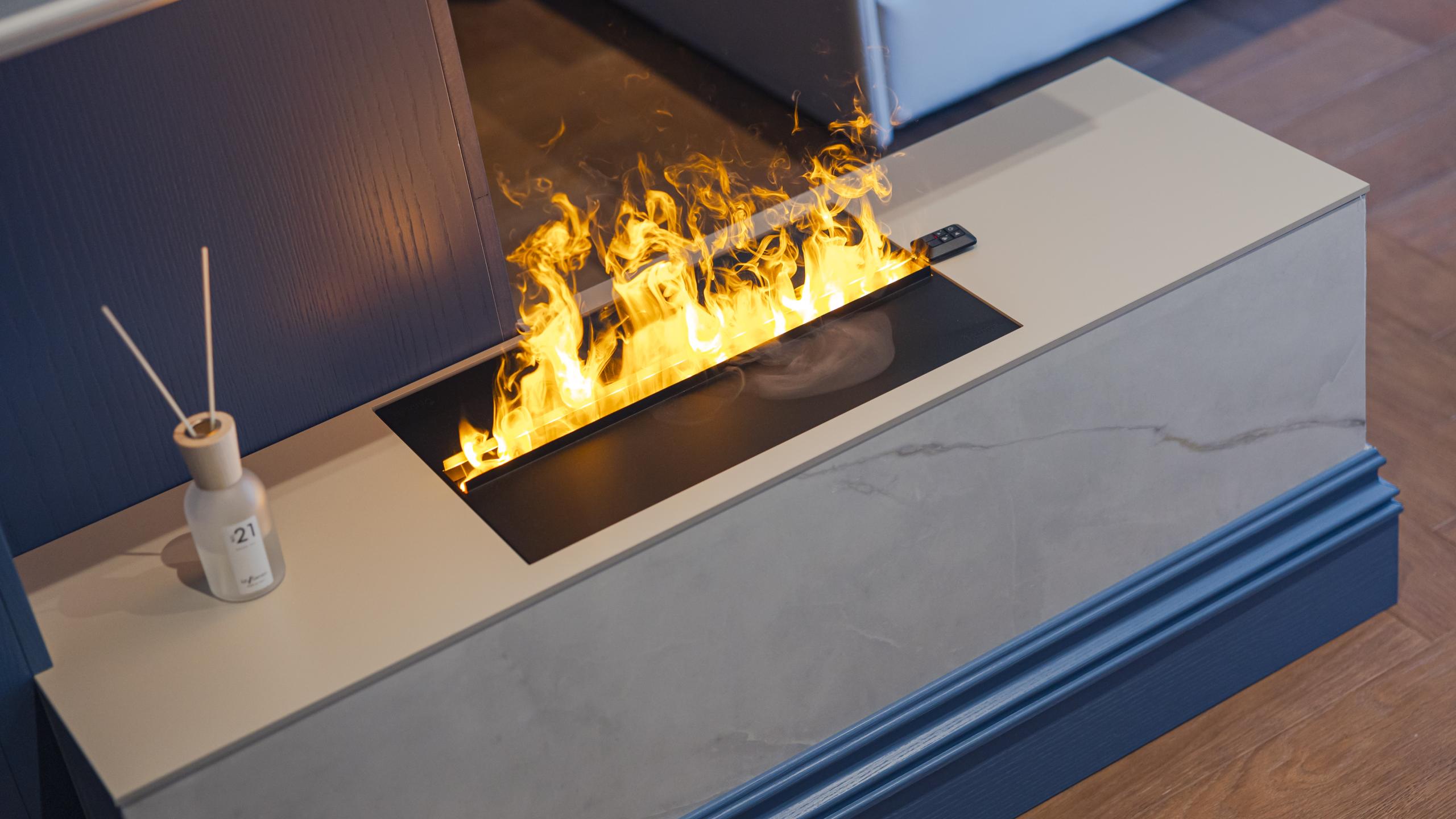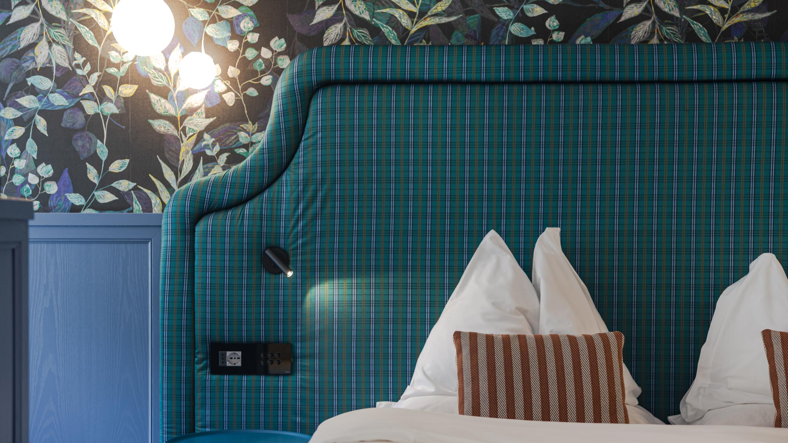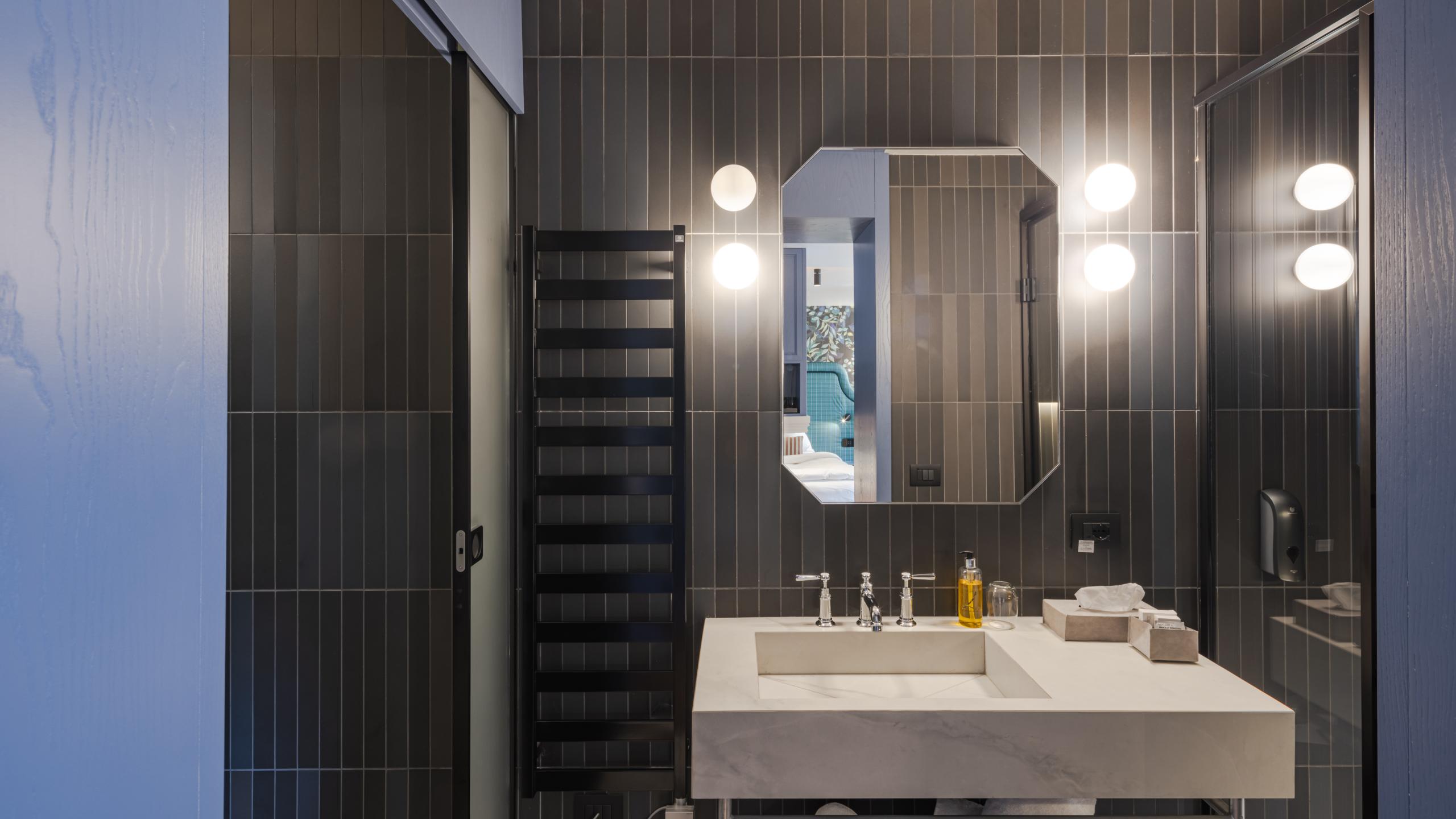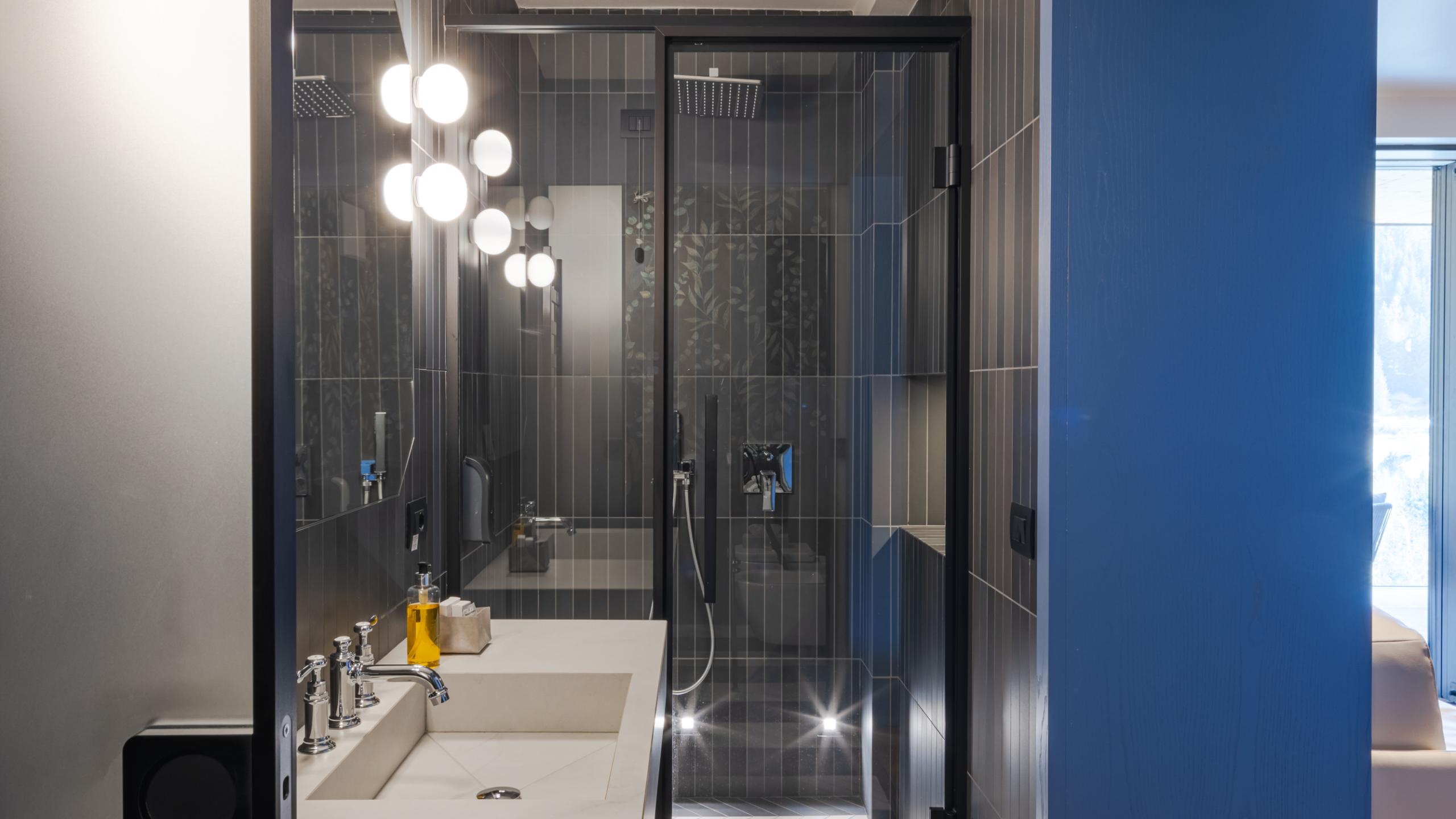 Il restyling dello spazio è disegnato come un abito: fantasie geometriche e floreali, tessuti morbidi al tatto, lampade gioiello. Pavimento in legno naturale posato a mosaico intarsiato, composto da quadrotte. Il caminetto scenografico a vapore in marmo bianco venato si inserisce nella boiserie blu bovary. Il soffitto è di un elegante color cenere e l’architettura del bagno acquisisce forme più scandite e industriali; i materiali dominanti sono il vetro, il ferro e la ceramica. L’elemento iconico della camera è la zona lounge dotata di divano, morbido e perfetto per godere momenti di relax.