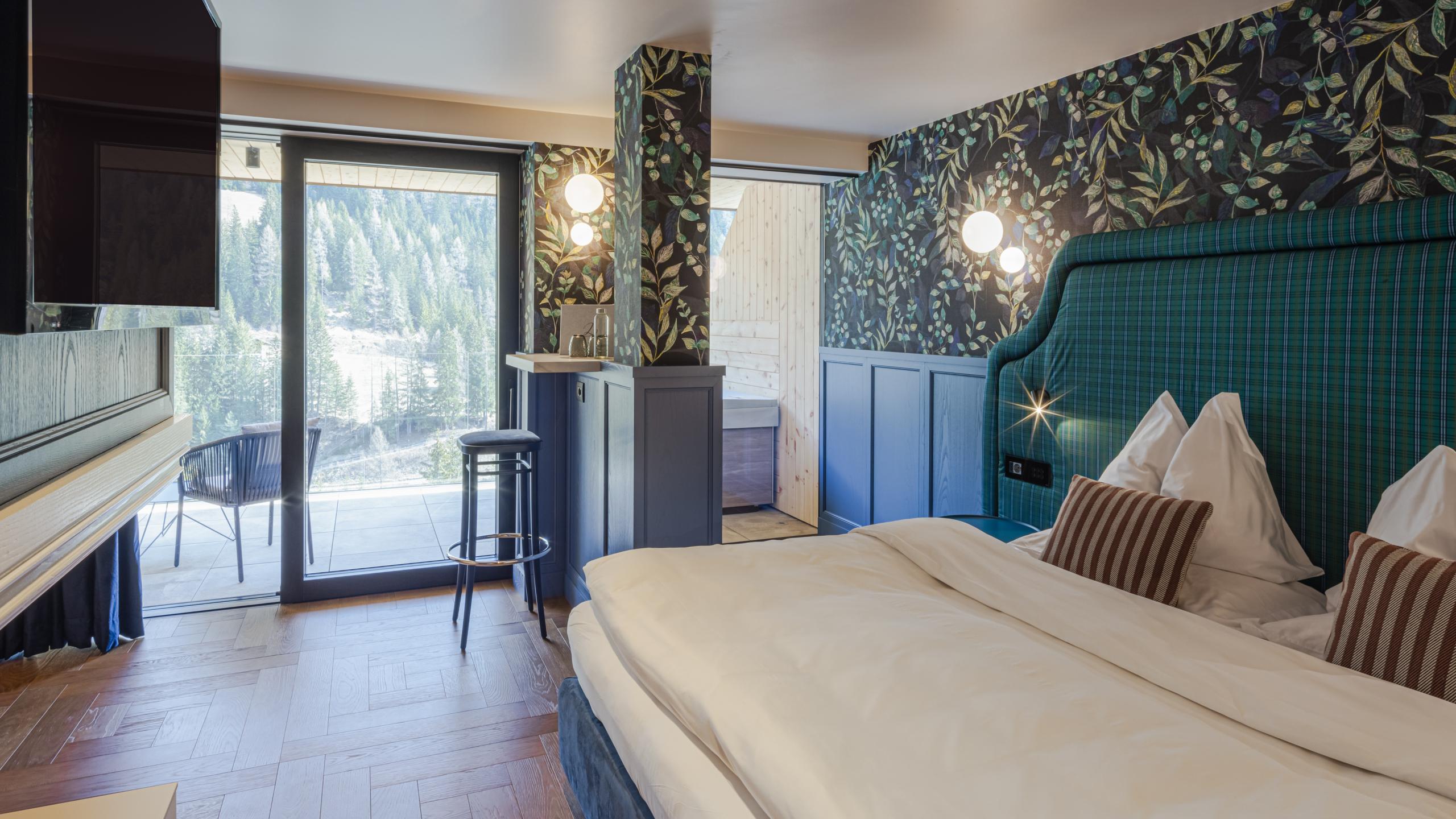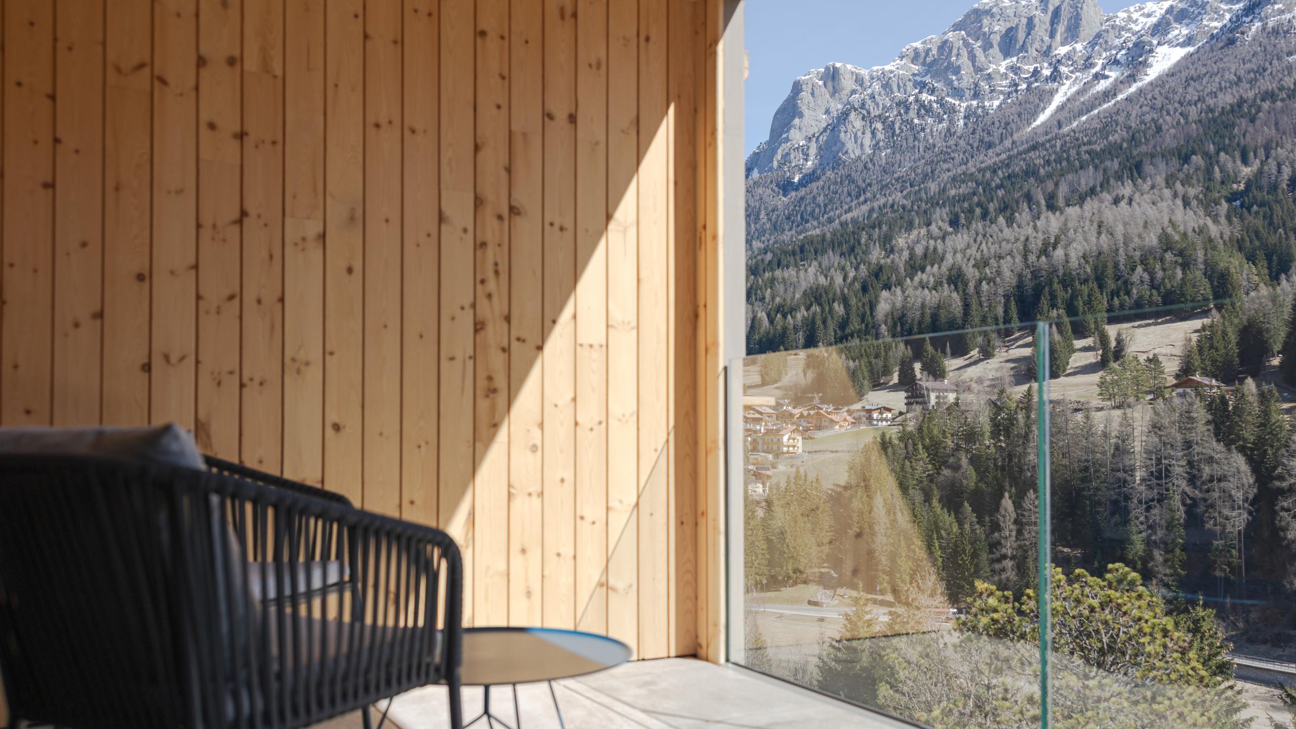 La suite è dotata di minibar con bevande selezionate a km0, zona bollitore con tè, tavolino smart working con sgabelli alti, materasso matrimoniale con comodo topper, doccia, smart TV 50’’, scaldasalviette per riscaldare il Vostro accappatoio, touch icons per creare atmosfere luminose diverse e ampio terrazzo privato coperto con tavolino e poltrone, da cui si gode dell'inconfondibile #latemarview sulle Dolomiti UNESCO grazie al parapetto in vetro.