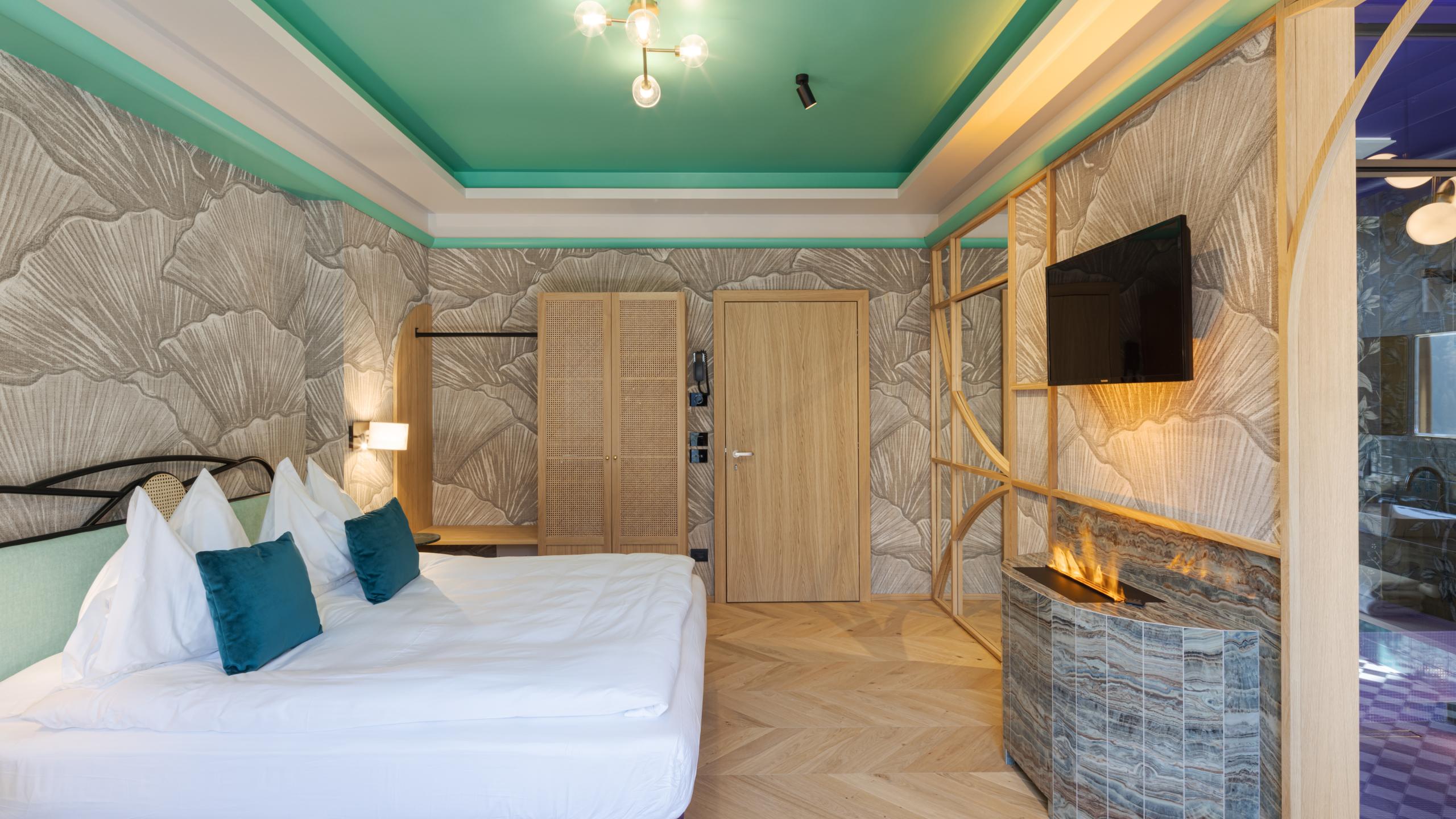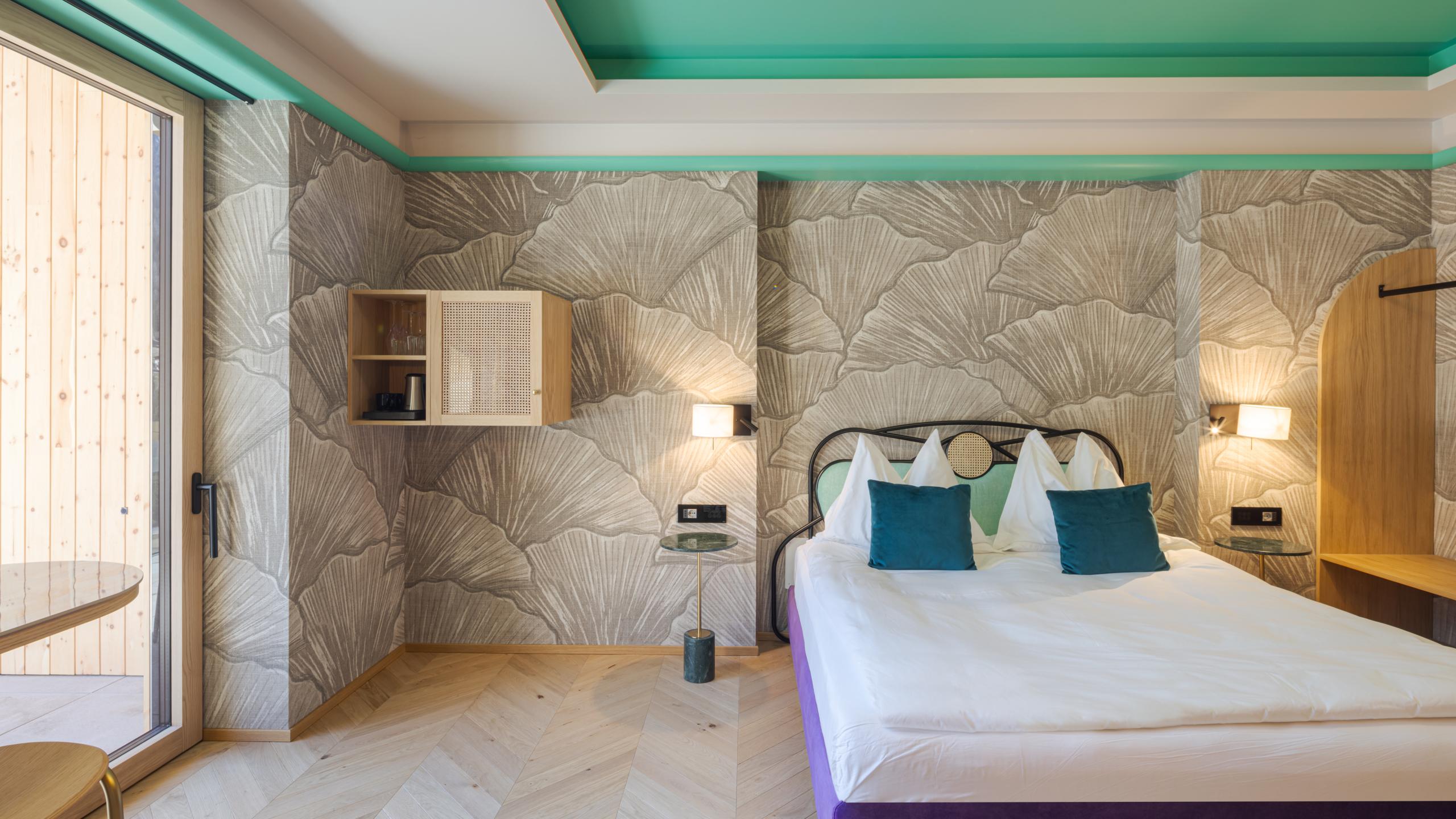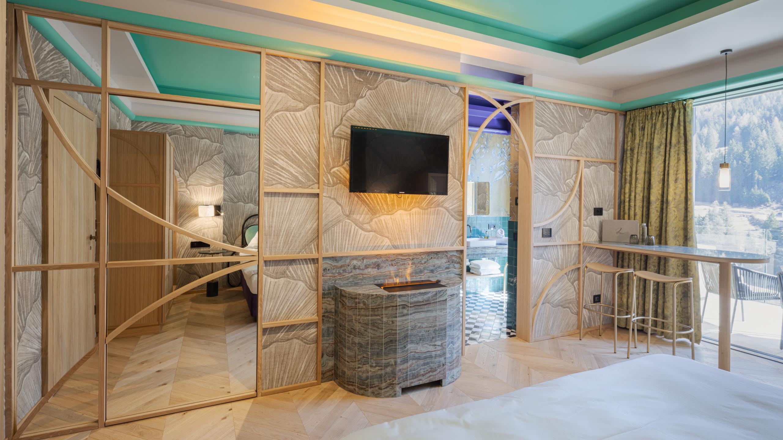 La suite è dotata di minibar con bevande selezionate a km0, bollitore con selezione di tè, tavolo smart working con sgabelli alti, materasso matrimoniale con comodo topper, doccia, smart TV 50'', scaldasalviette per scaldare l'accappatoio, icone touch per creare diverse atmosfere luminose e un ampio terrazzo privato coperto, attrezzato con tavolo e sedie, dal quale si può godere dell'inconfondibile #latemarview delle Dolomiti UNESCO grazie al parapetto in vetro.