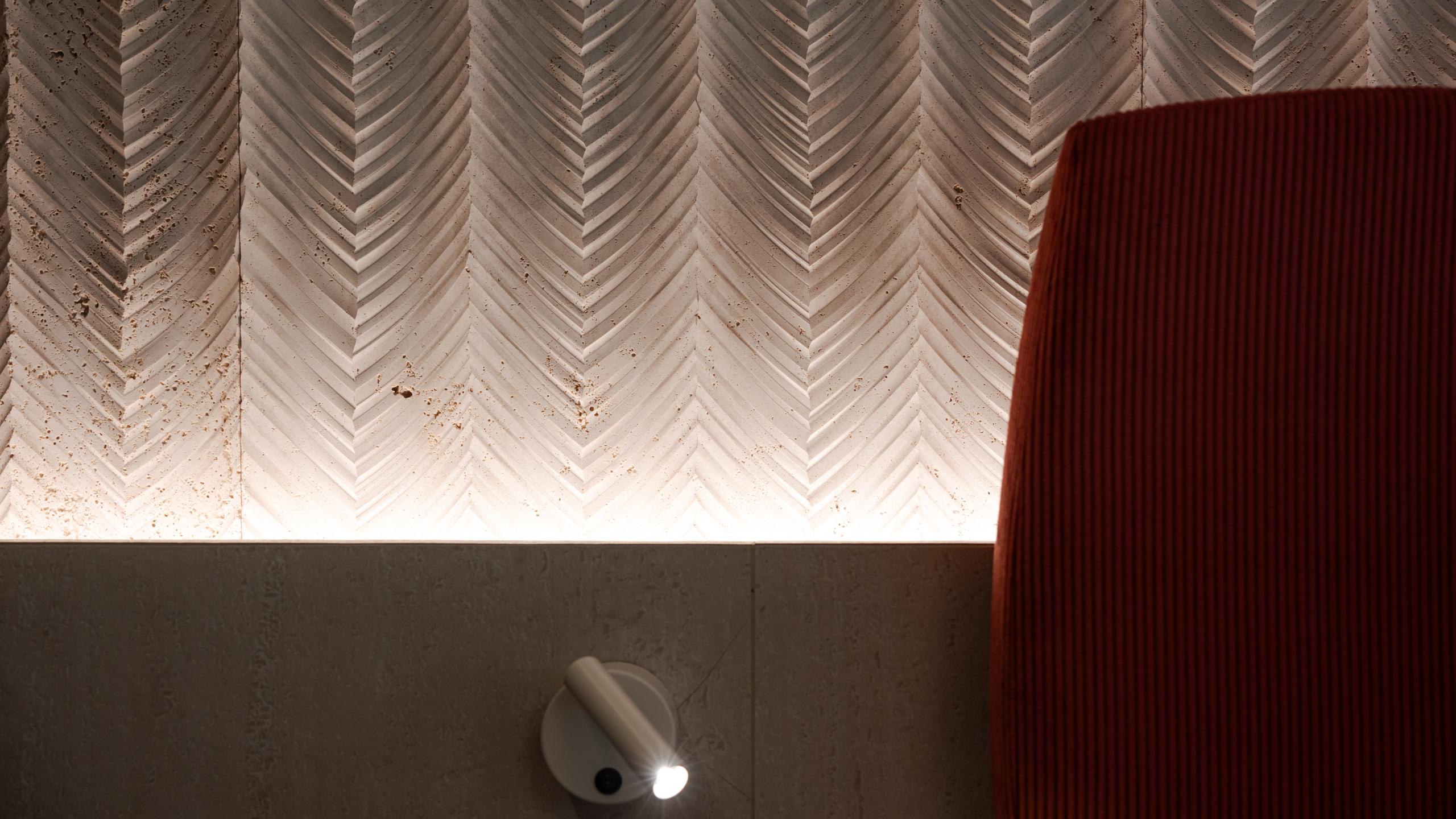 Die Elemente, aus denen der Raum besteht, sind metaphysisch geprägt und übernehmen Prinzipien wie Rationalität, Ordnung und Wiederholung. Die Anordnung der Möbel wird durch Rundbögen, Säulen und glänzende Kugeln ausgeglichen. Zimmer mit offenem Abstellraum aus edlem Travertin und Holz. Naturholzboden mit eingelegtem Mosaik, bestehend aus Fliesen. Spiel der Reflexionen durch Hohlräume, Glas und Spiegel.htisch, Hockern und TV. Minibar im Stauraum.