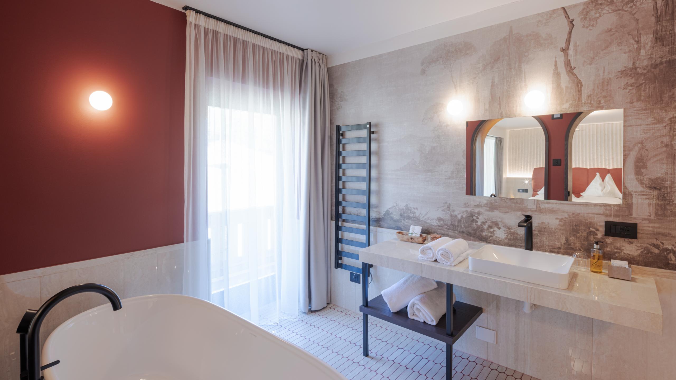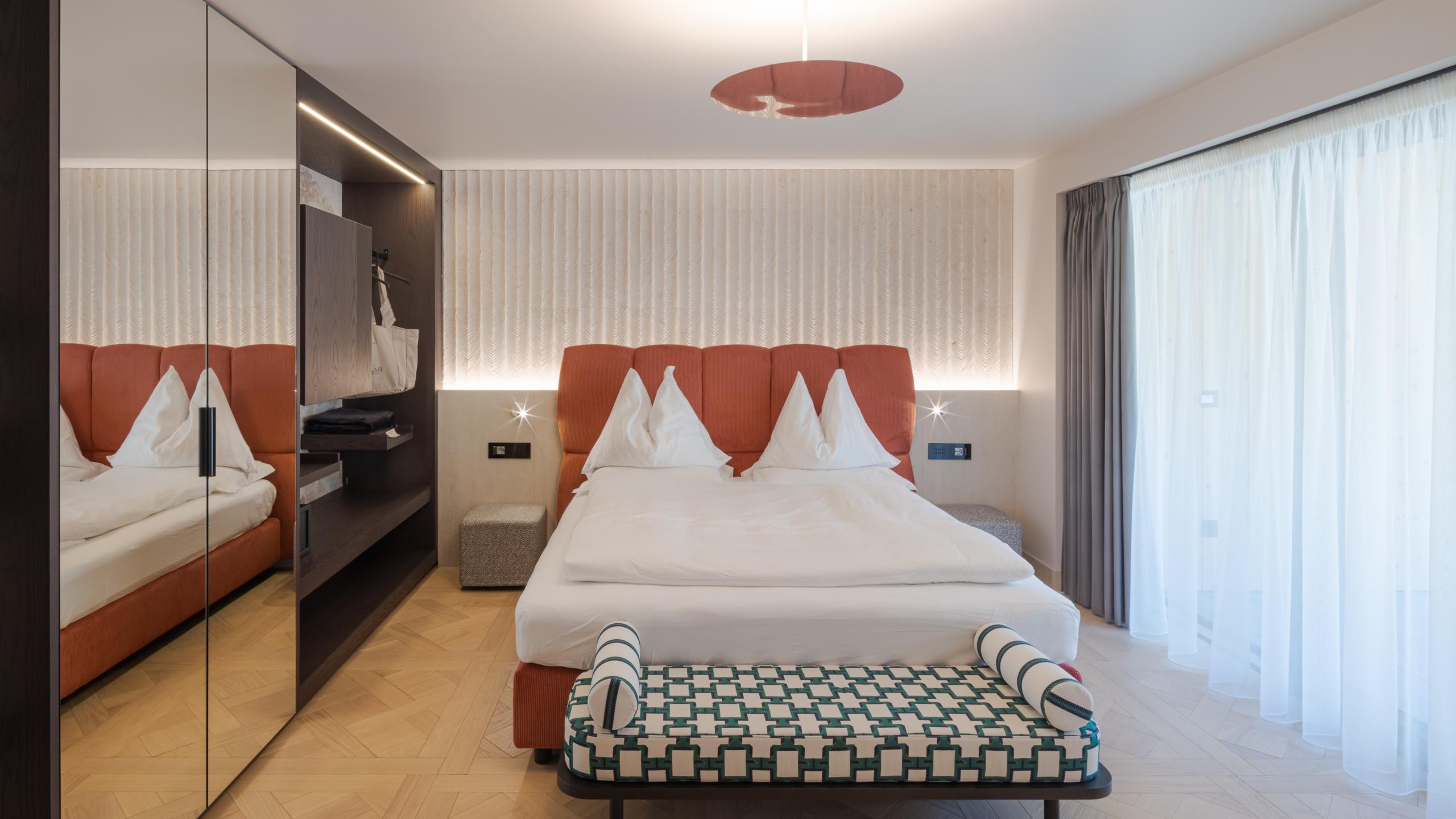 It is equipped with a mattress with comfortable topper, minibar with selected 0 km drinks, smart working table, double mattress with comfortable topper, kettle with selection of teas, shower, smart TV, towel warmer to heat your bathrobe, laptop size safe, touch icons to create different bright atmospheres and a large private covered terrace with table and armchairs, from which you can enjoy the unmistakable #latemarview of the UNESCO Dolomites thanks to the glass parapet.