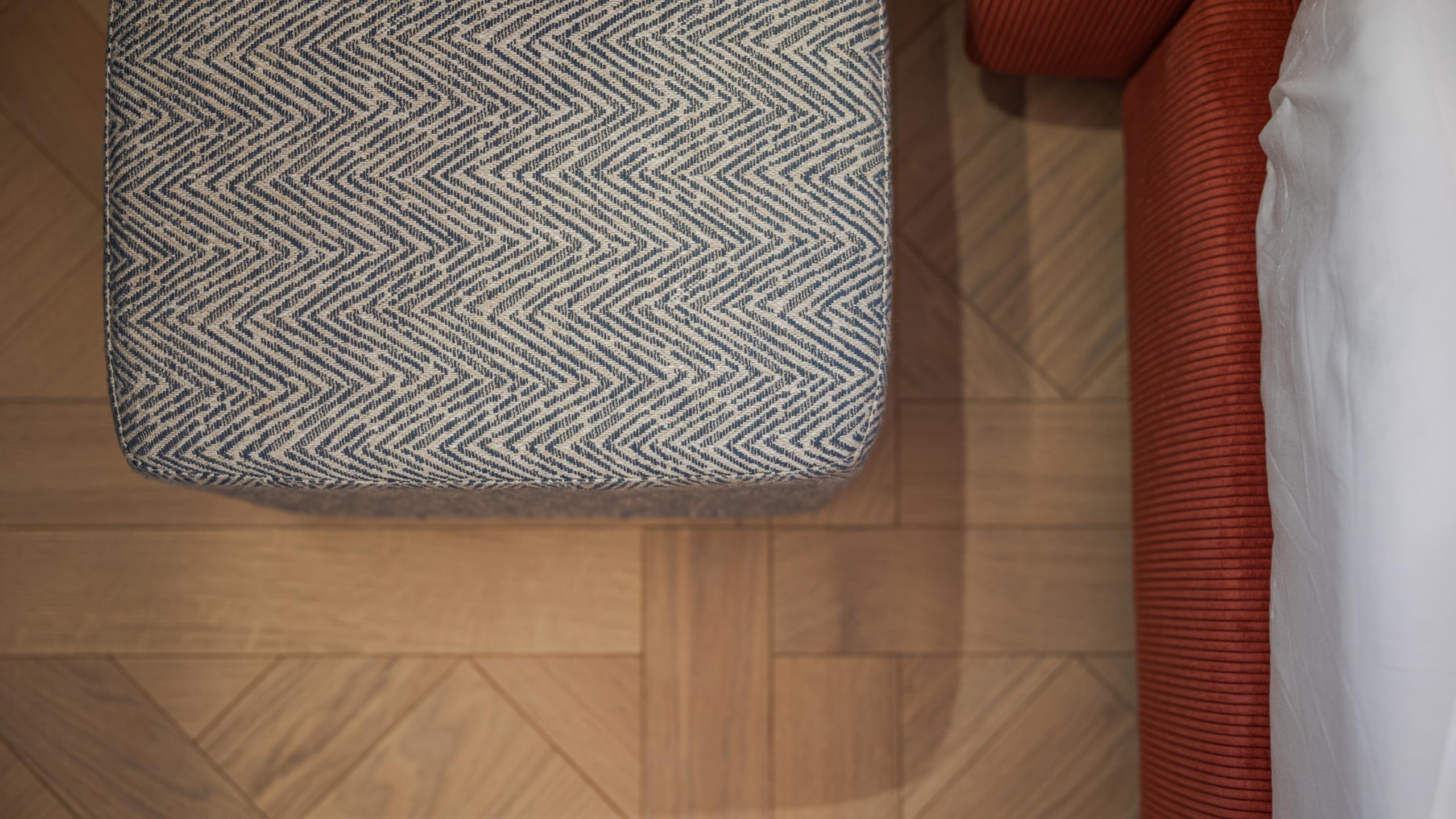 The elements that compose the space make a metaphysical impression and embody principles such as rationality, order, and repetition. The arrangement of the furniture is balanced by rounded arches, columns, and spherical lights. The bedroom features an open storage space made of travertine and wood. The natural wooden flooring is laid in square mosaic patterns. The empty spaces, glass, and mirror create an interplay of reflections.